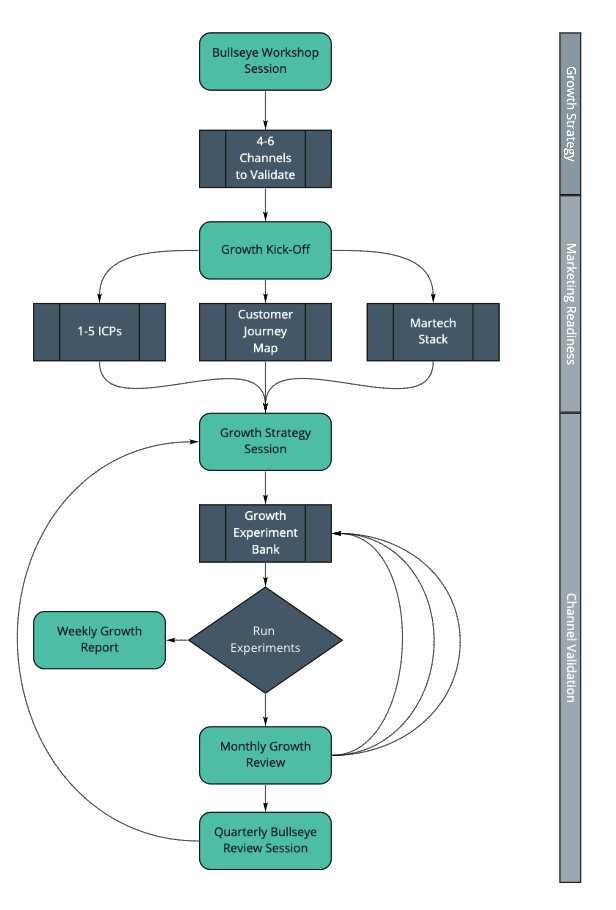 During this phase we hold a ‘bullseye’ session with the client to determine what marketing channels we’re going to test and validate. We go through each one of the channels in the bullseye framework and generally decide on 4-6 channels to test over a 3 month period.