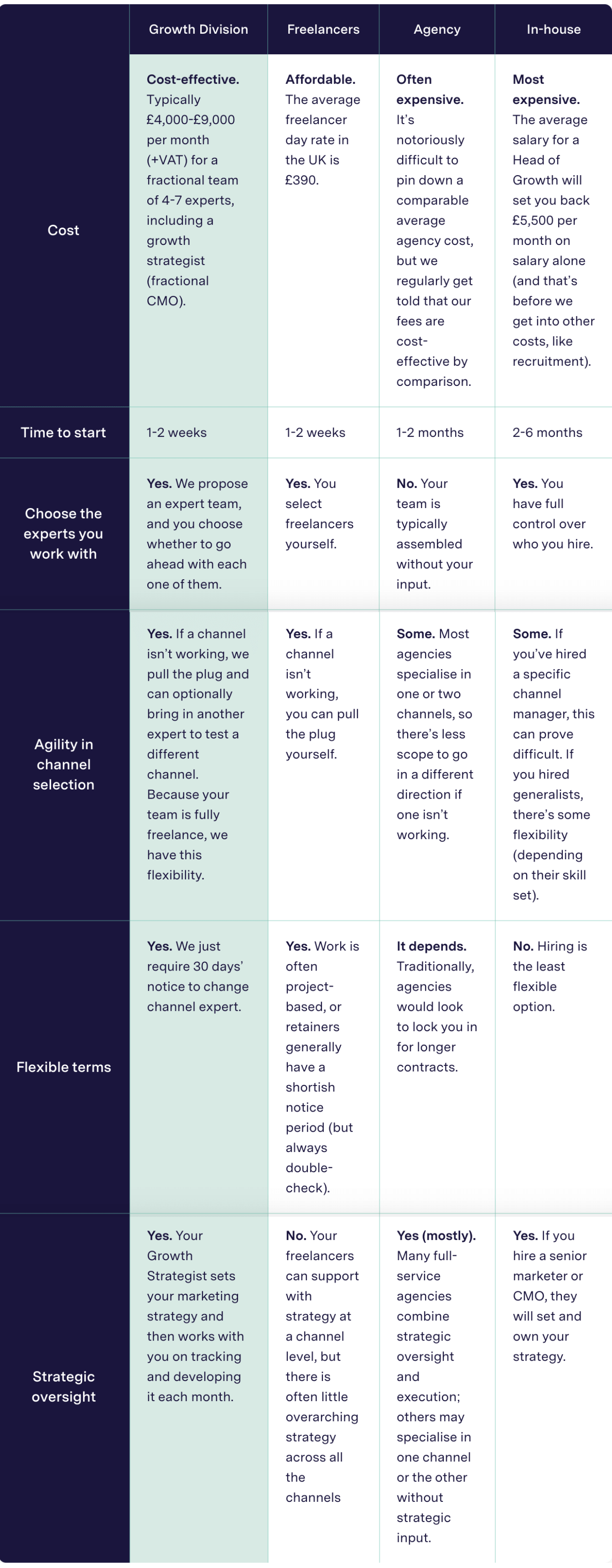 If you’re currently debating how to approach marketing for your startup, here’s my honest take on your options (and a look at where Growth Division sits amongst them).