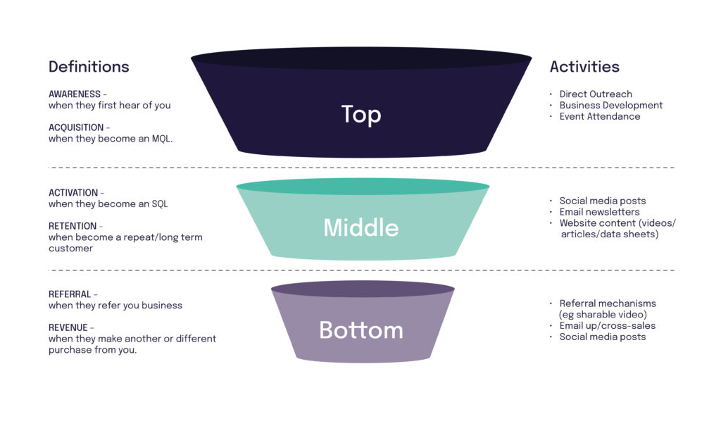 We use the 'pirate' (say AAARRR!) metrics framework to think about marketing and sales funnels at Growth Division. It varies hugely depending on the business and sector but here's an example: