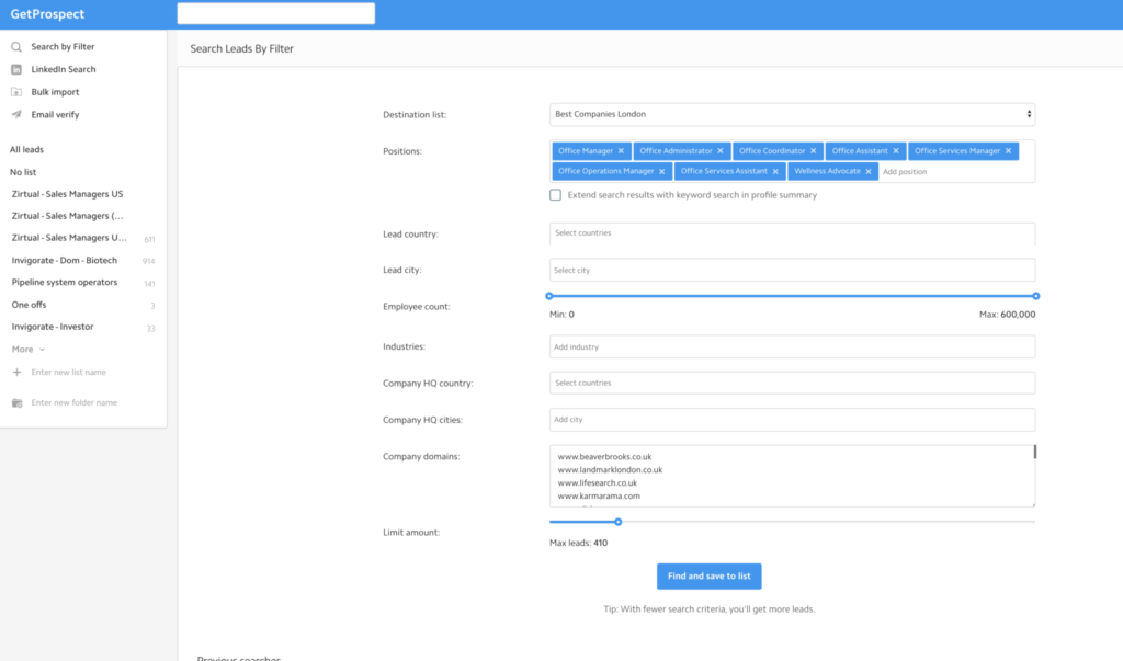 Once you’ve identified your Ideal Customer Personas (ICP) you can get cracking on gathering your lead data. You can either head to Sales Navigator and set-up your filters (job title, country, company size, LinkedIn groups etc.) or you can search directly in GetProspect. Searching within the tool also allows you to search by company domain, then find the people with specific job titles in those companies.